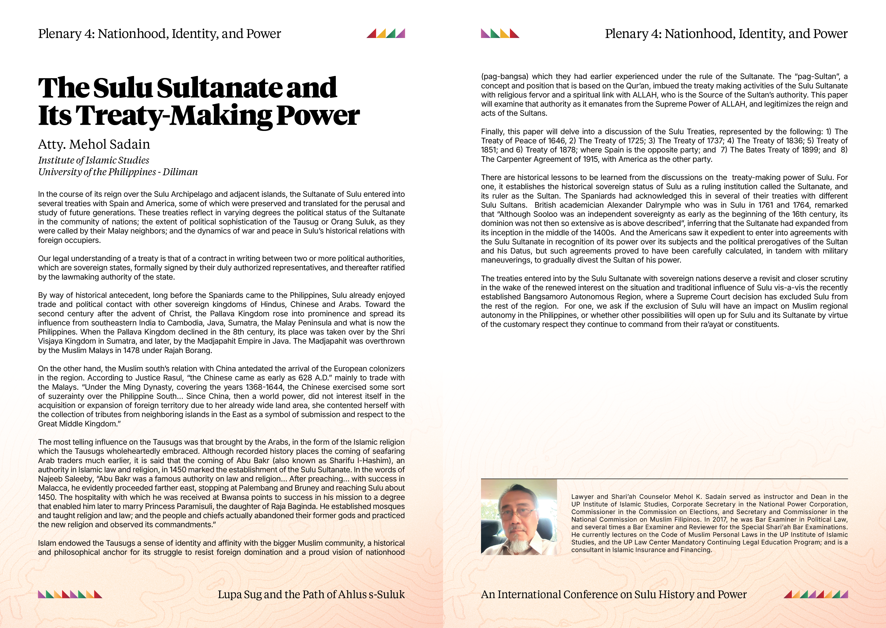 The Sulu Project 2025: Lupa’ Sug and the Path of Ahlu s-Suluk – International Conference on Sulu History and Power shall explore four key themes. Weigh in as leading scholars explore Sulu’s rich heritage (History & Culture), tackle its journey to peace and prosperity (Peace), unlock its immense potential for sustainable growth (Economy & Development), and understand the zone’s evolving identity and power (Nationhood, Identity, and Power) in our plenary sessions. This exciting event shall also feature cultural performances and immerse you to the heart of Sulu.