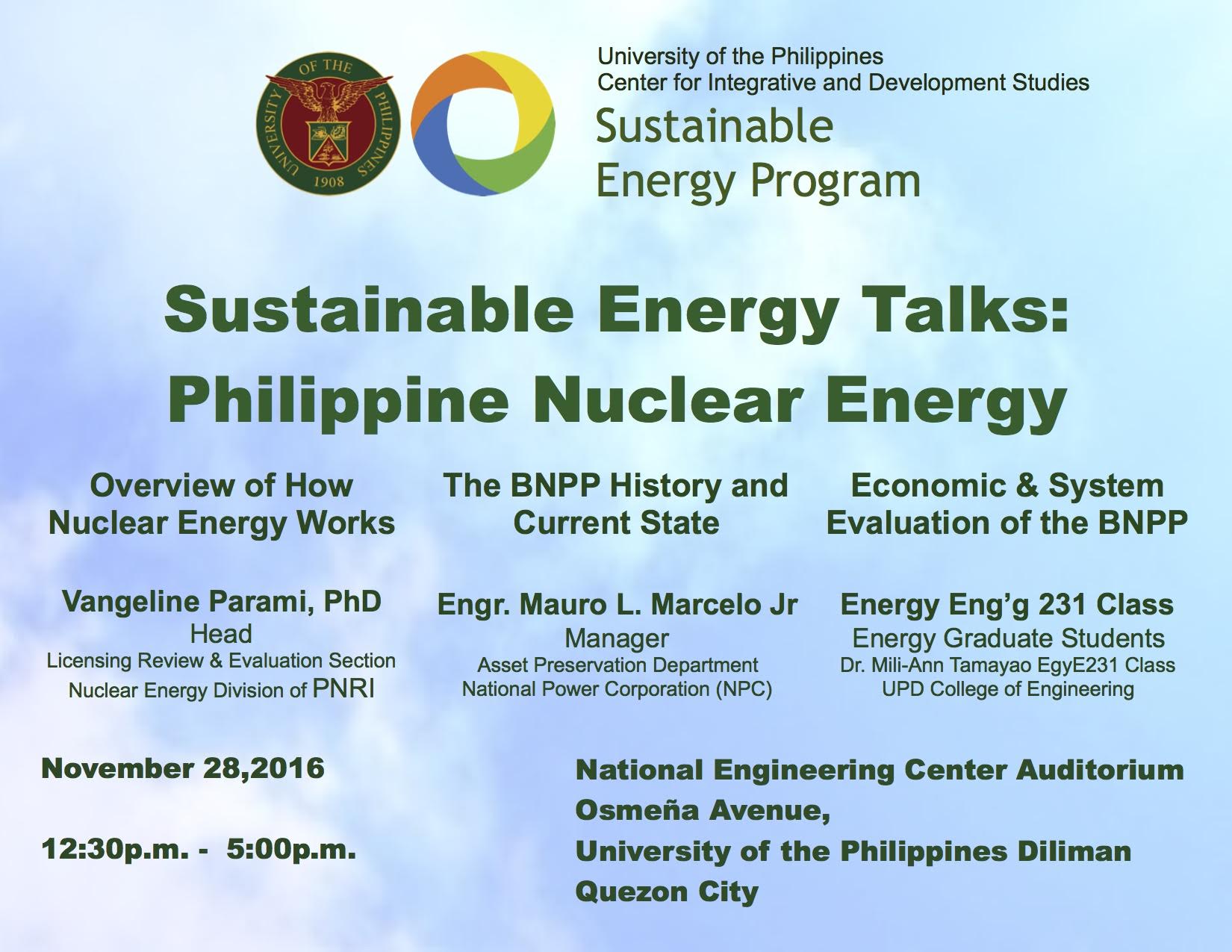 On November 28, 2016, we will be talking about Philippine Nuclear Energy with a focus discussion on Overview of How Nuclear Energy Works, The BNPP History and Current State, and Philippine Nuclear Energy: Economic and System Evaluation of BNPP .